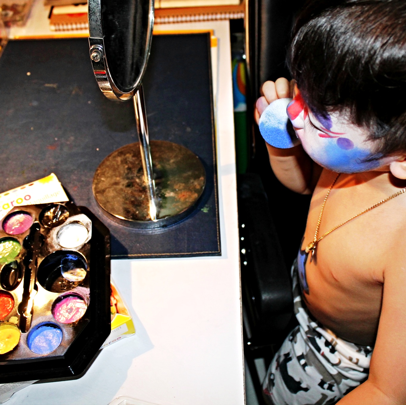 I used Snazaroo Face Painting kit for this. Be sure to do a skin test before using 🙂 After a while, he wanted to do it on his own. So I let him paint over the face that I painted.