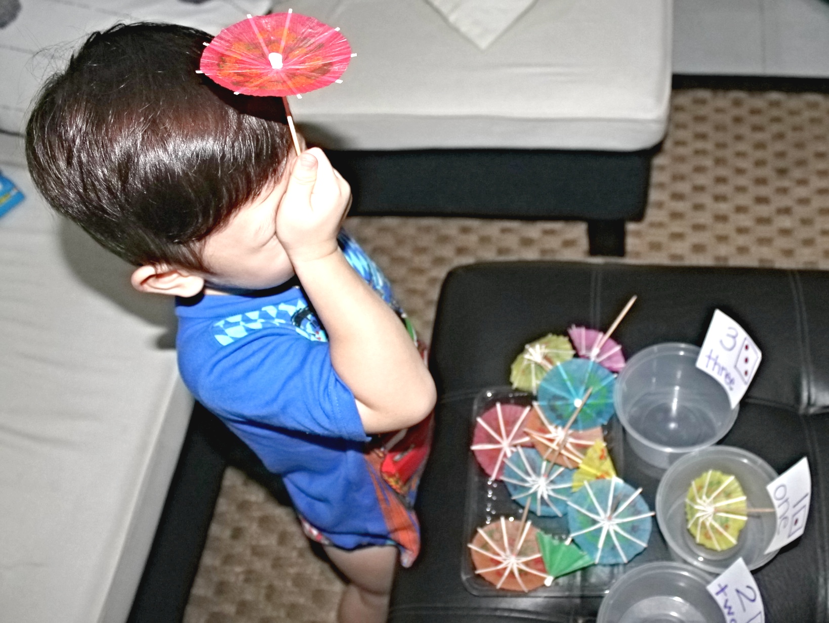 Found these umbrellas at the supermarket and decided to use them as counters. Here’s a picture of Caleb putting them into plastic cups labelled with numbers. This activity is more challenging than the counting cards activity