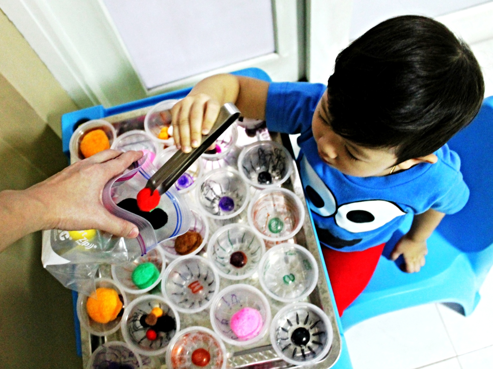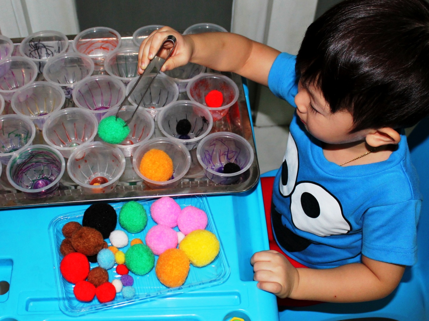 I guess he got tired, so I let him “pour” the pompoms into the bag instead. Way to go! Practice for pouring 🙂 This activity was good practice for fine motor skills and it was fun as well!