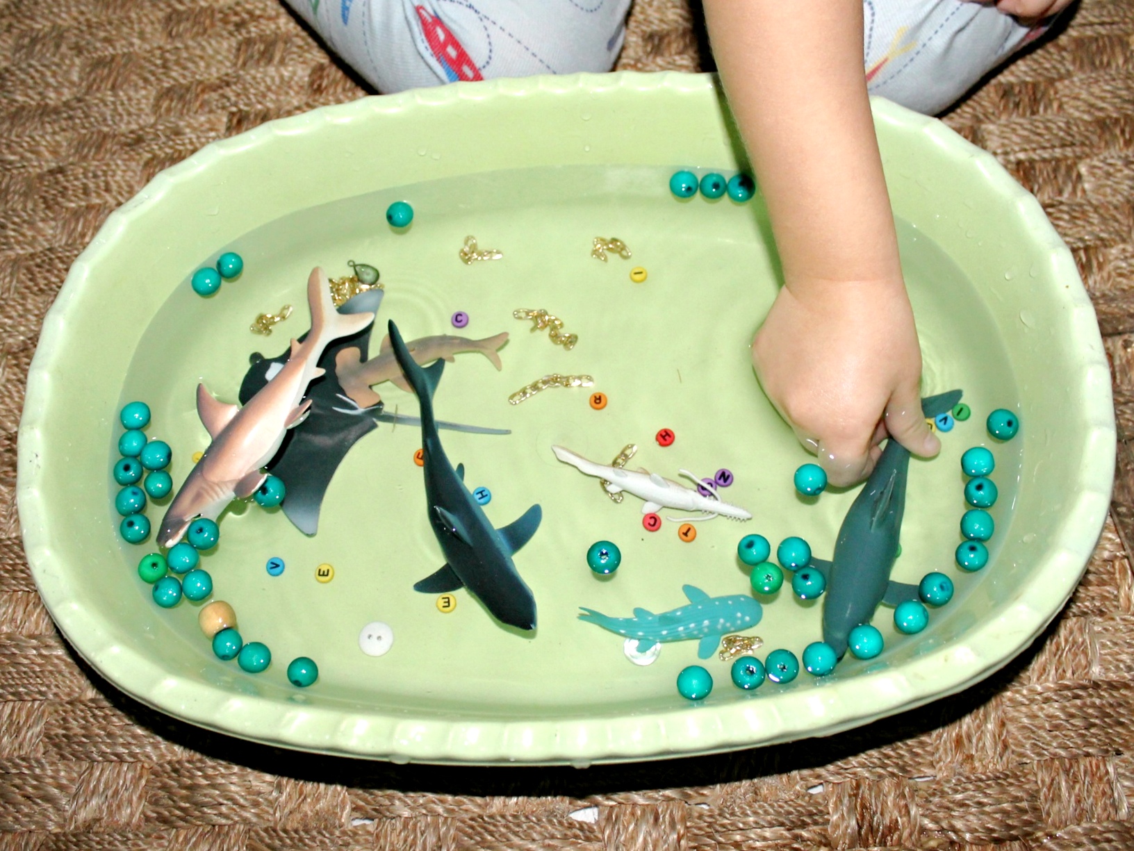 He did this activity for such a long time–around 30-45 minutes! From investigation of floating and sinking, it evolved into playing with sharks in the water, scooping, and pouring. He didn’t want to stop playing but it was time for dinner. So he fished out the beads, and we packed away together.