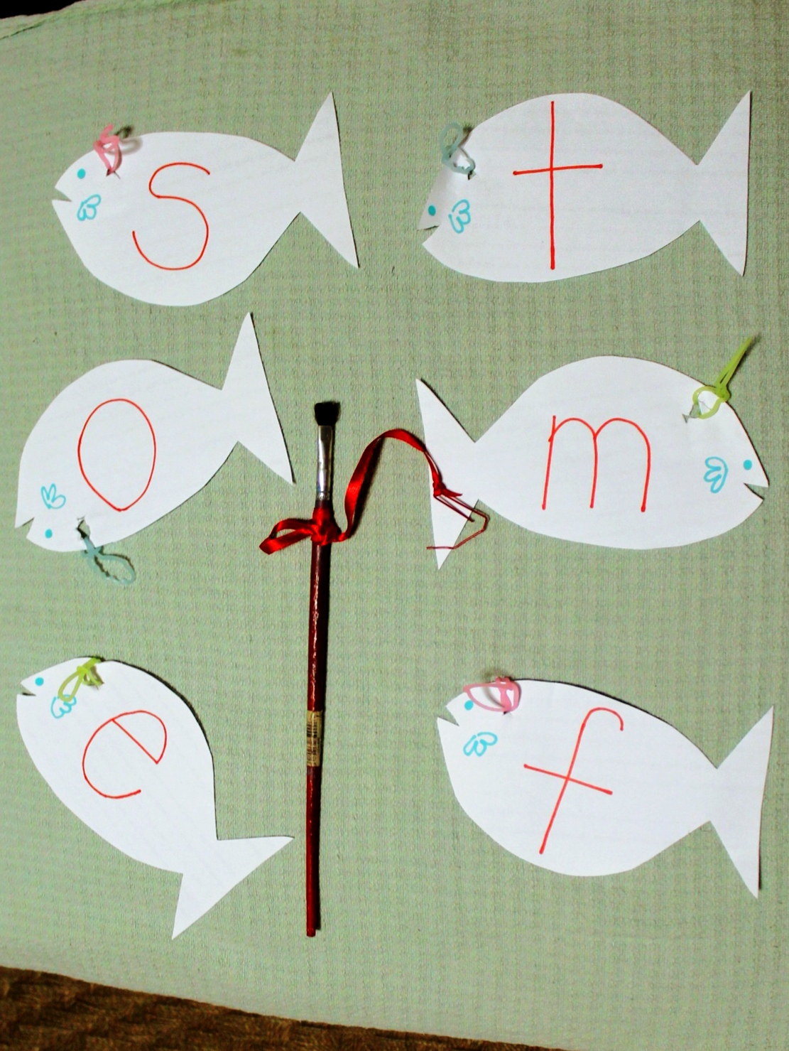 I drew some letters and poked holes in them. I fastened some rubber bands to them. So they could be hooked to our make-shift fishing rod.