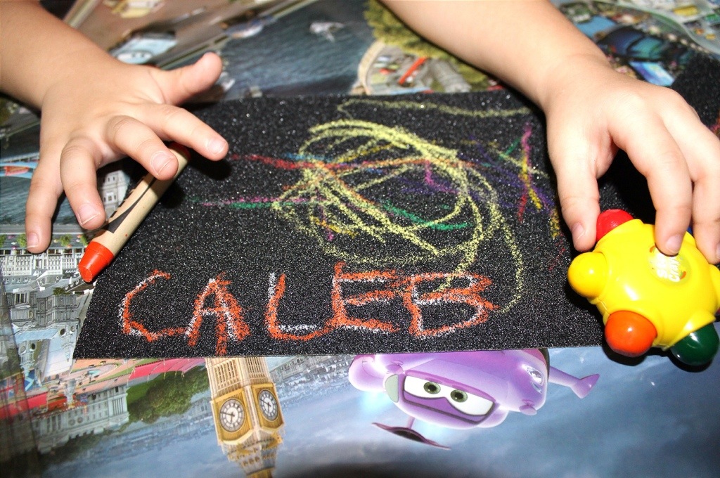I provided Caleb with different coloring materials and let him choose which one was the best to use on the rough paper. Here, he’s testing out the coloring materials.
