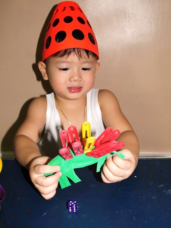 I drew two dinosaurs. Prepared clothespins and a dice. Caleb insisted on wearing his silly hat.