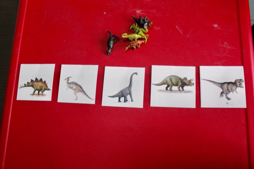 Mateo loves dinosaurs and farm animals so we have a lot of those at home. Little animal and dinosaur figures are perfect for matching!