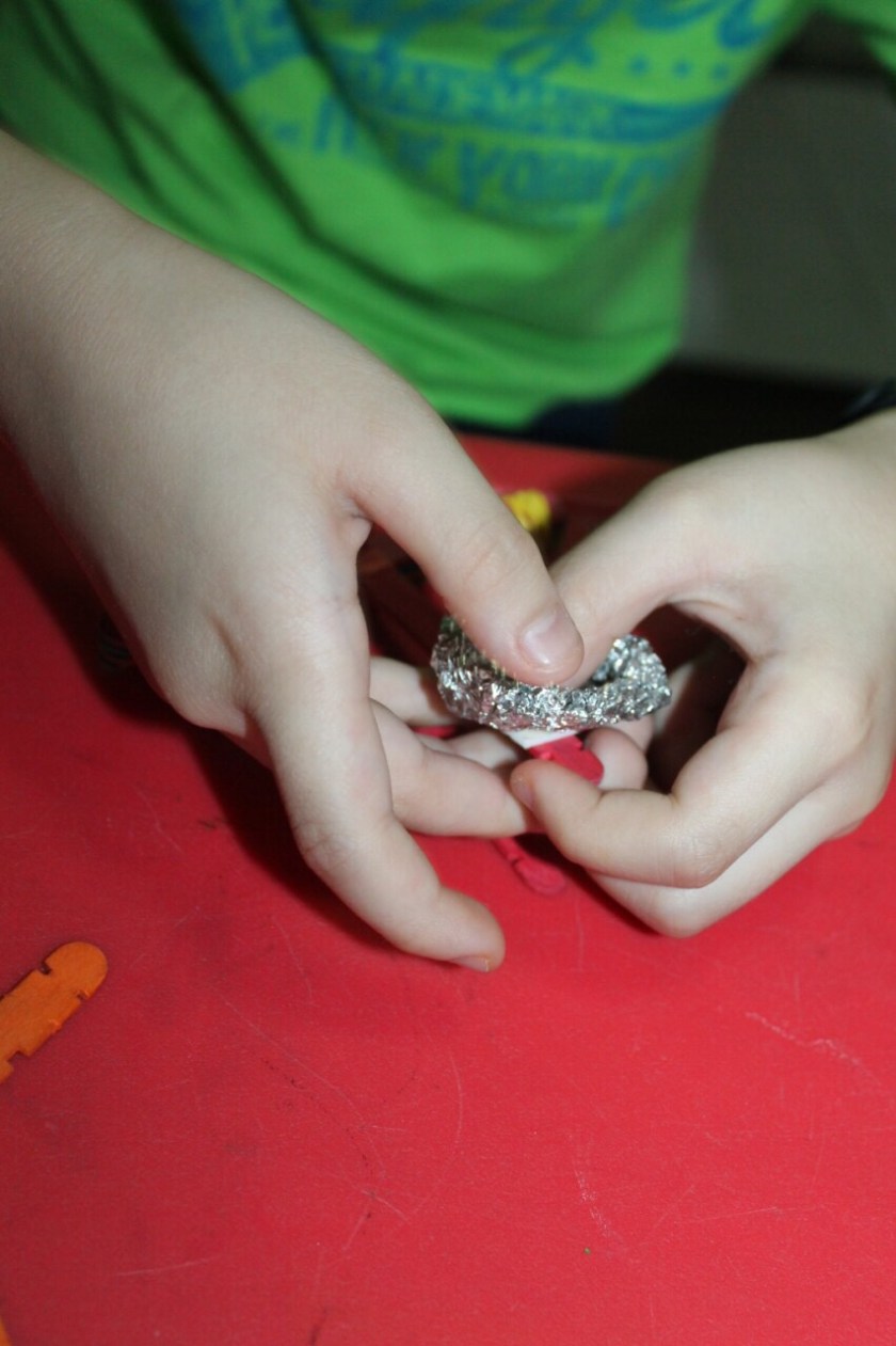 Crumple the aluminum foil to form a mini cup. Then stick it on to the double sided tape.