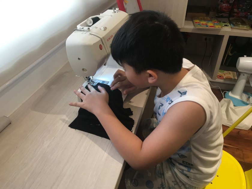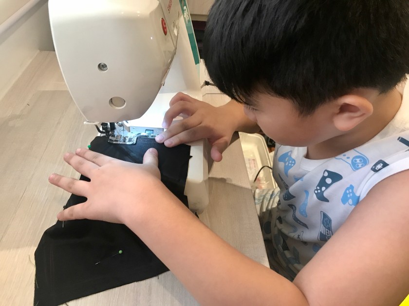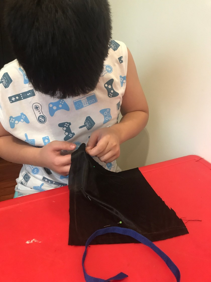 Here, he is learning to pin the fabric together and do a backstitch by hand.
