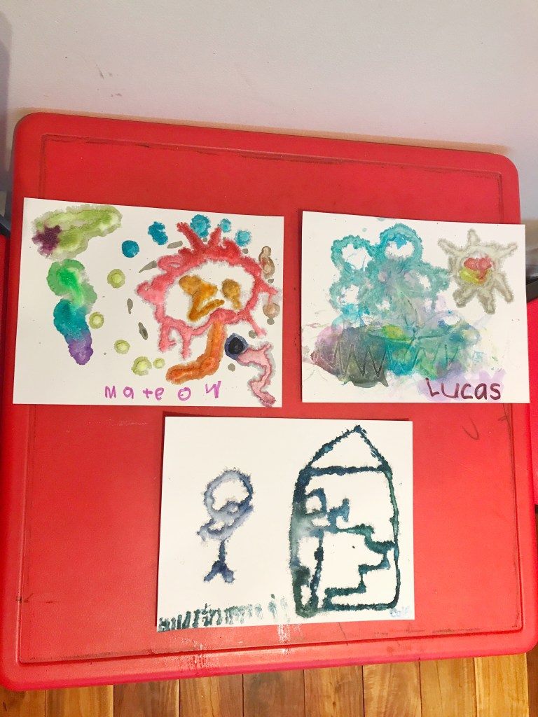 Younger kids might brush on the salt instead of dropping the paint onto it. Lucas, my two year old did that 😂 It’s fine, as long as he’s still painting and enjoying the process. Maybe I should’ve given him a dropper and colored water. Oh well! Next time 😀