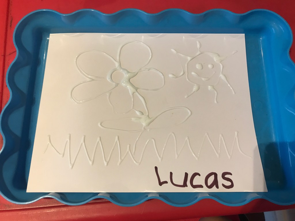 Step 1: Use the glue to draw a design on the paper. Make sure to put the paper on a tray so it will be easy to shake off the excess salt.