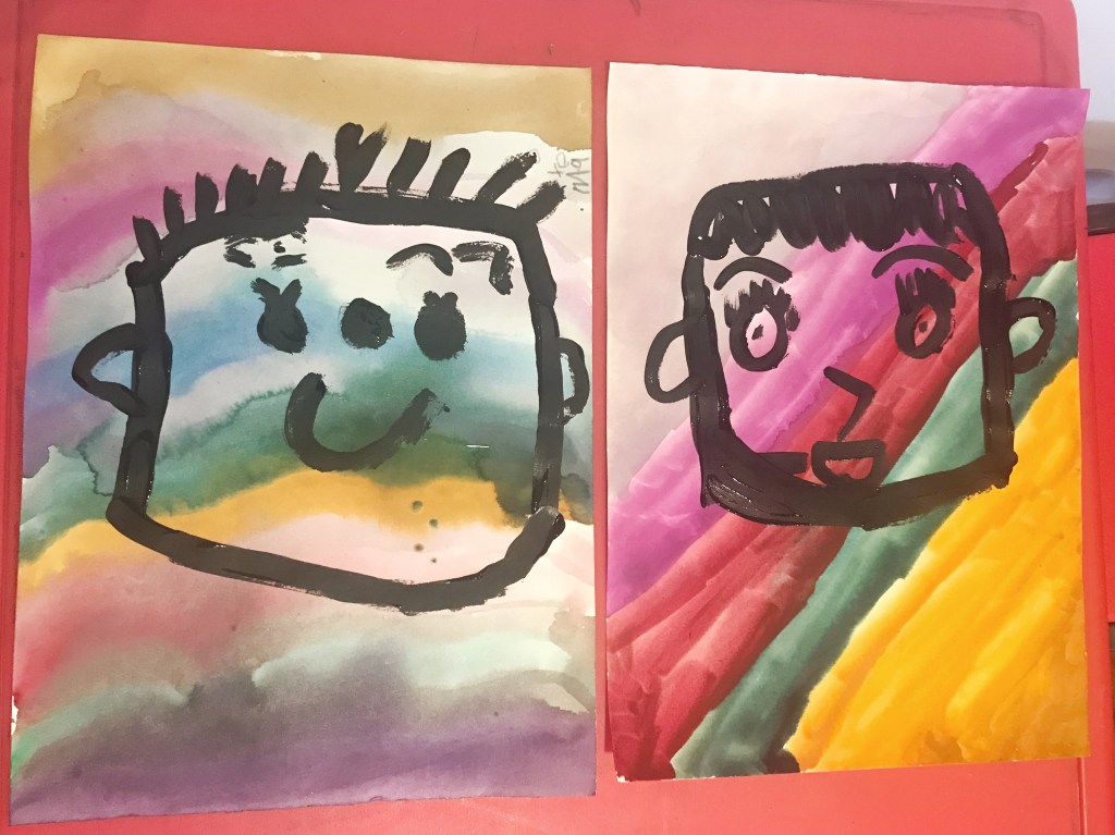 Let the background dry completely before starting the self portraits. This will take around 1-2 hours. The boys took a nap and we finished this when they woke up.