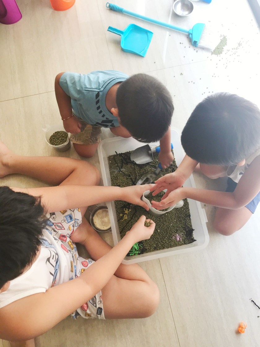 I prepared this activity for Luc and Teo but Caleb also wanted to join in the sensory fun. Well, the more the merrier and messier!!!
