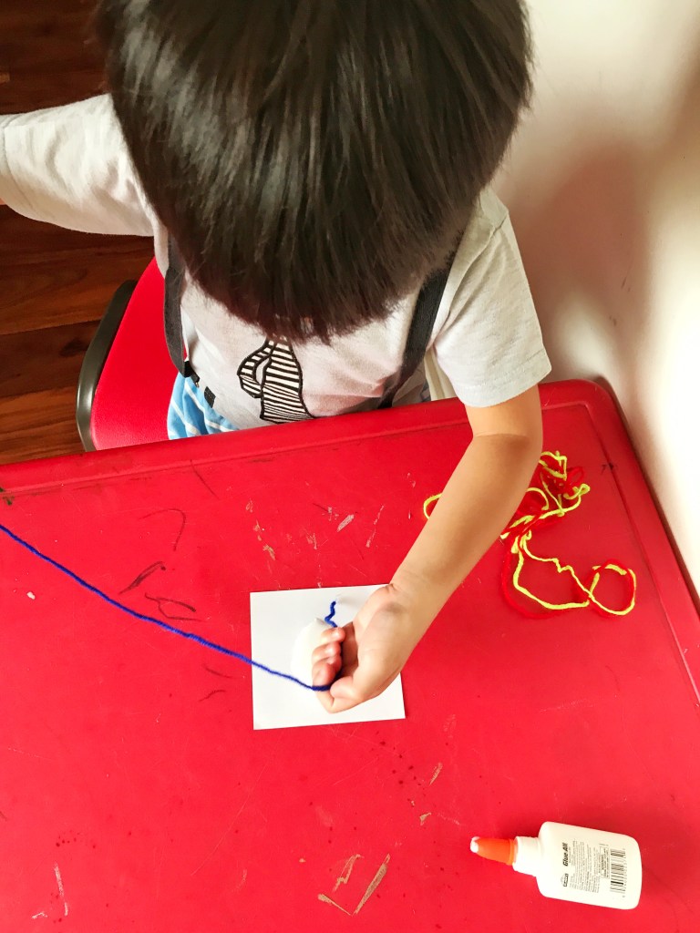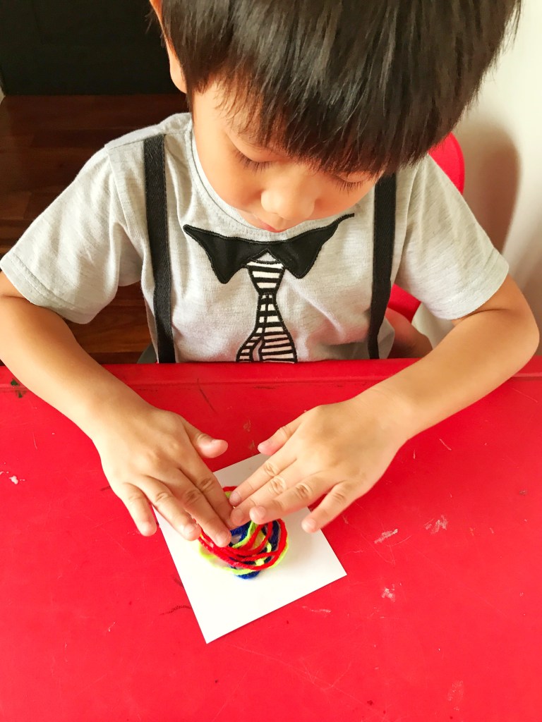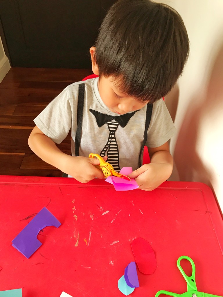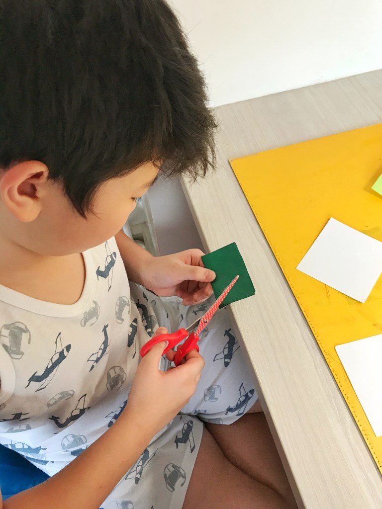 I cut and prepared 3” square papers for each of the boys. Two pieces for each activity so a total of ten pieces for each boy. This meant that they made 2 pieces for each activity.