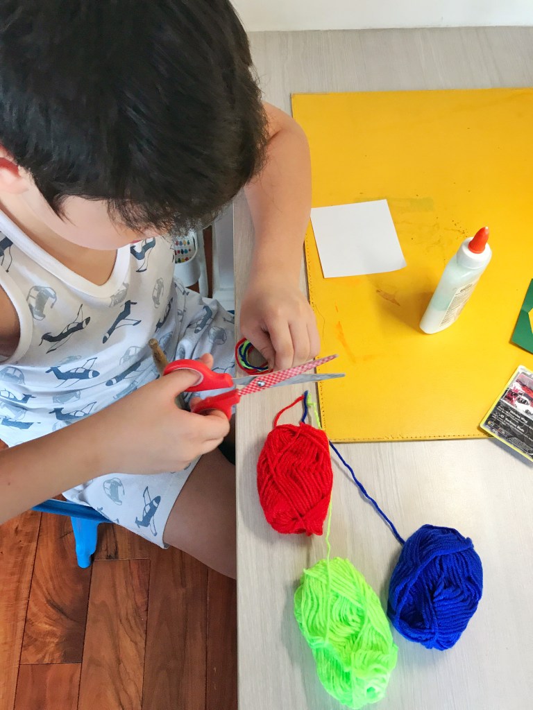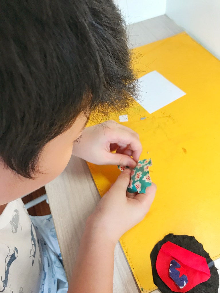 The boys used scrap fabric from my sewing projects to make circles. They enjoyed cutting the fabric as it was novel for them to cut it into circles as compared to cutting paper.