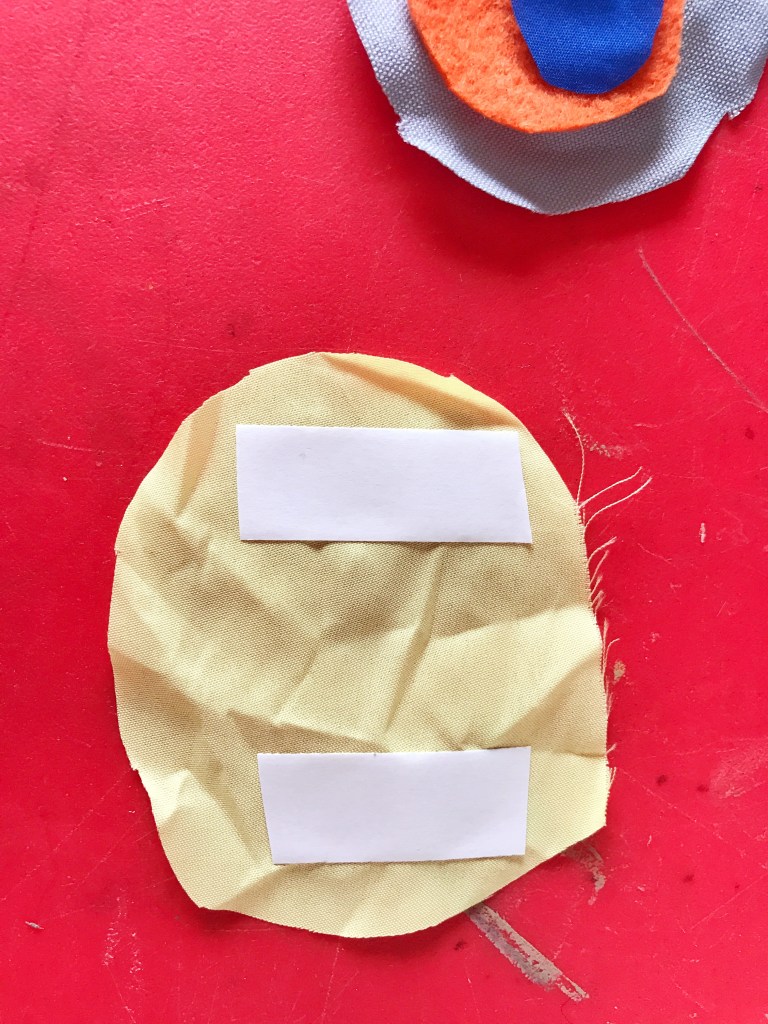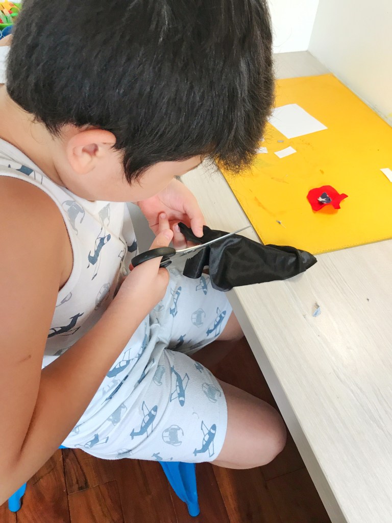 We used double sided tape to secure the fabric pieces together. Peeling off the double sided tape was tricky for my 4 year old, Teo, so I had to help him with this.