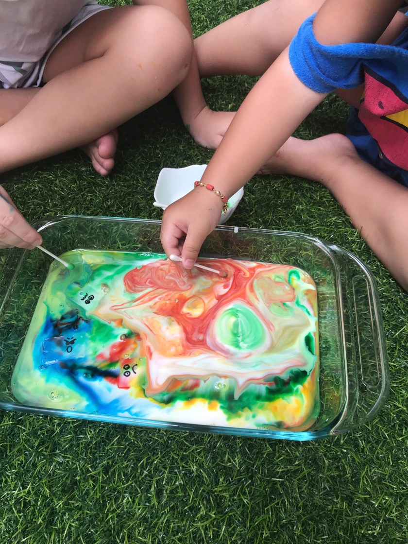 This reaction happens because milk is made up of minerals, proteins, and fats. When the dish soap is added to the milk, those molecules run around and try to attach to the fat molecules in the milk. The soap “runs” around after all the fats in the milk. This is the reason why the food coloring in the milk is important. It makes it easier for us to see this reaction.