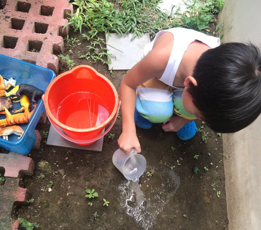 It was a sunny day when we did this activity, so we made the mud ourselves. We used two small pails of water to make mud.