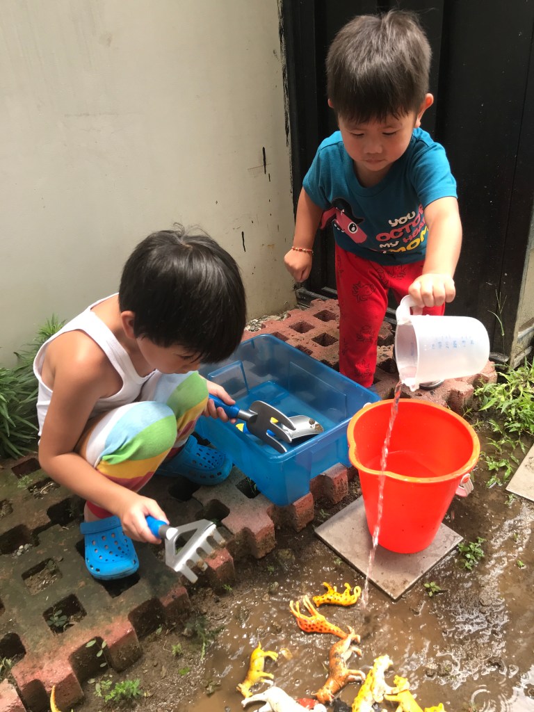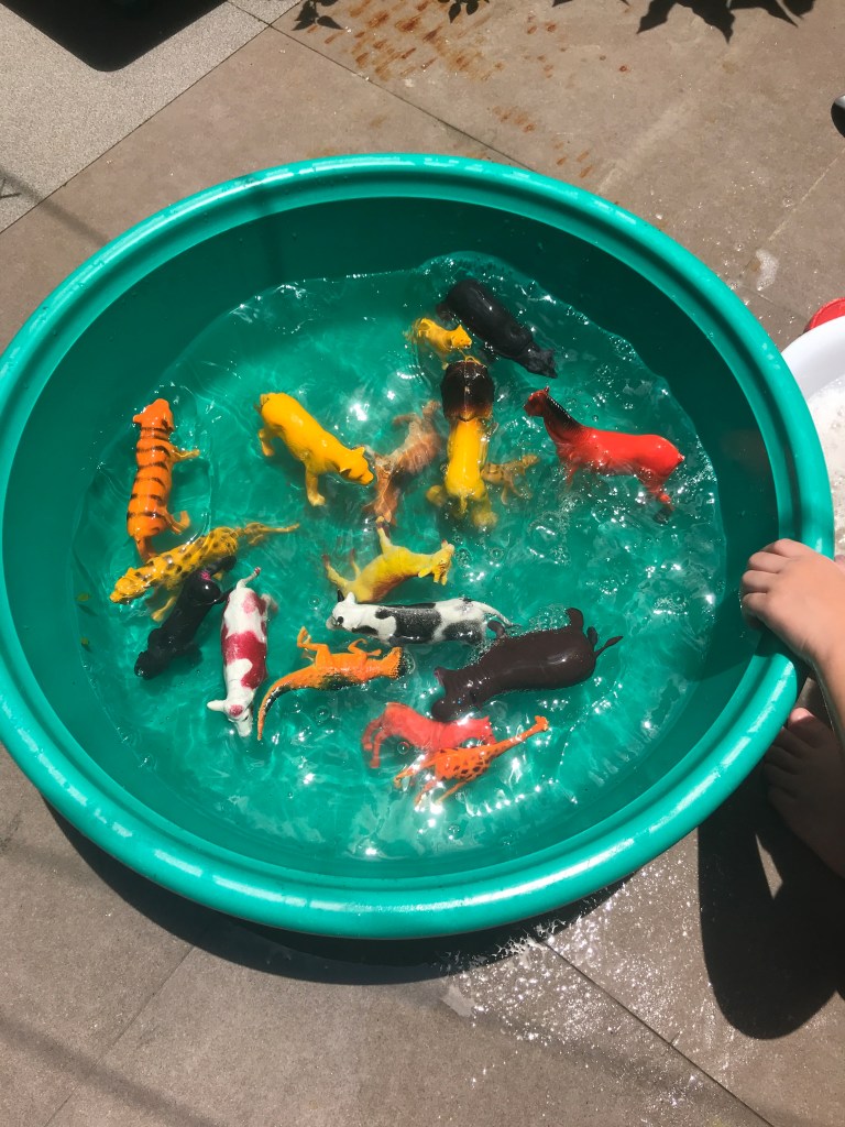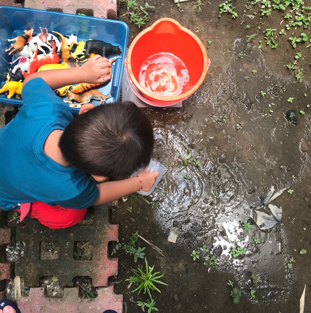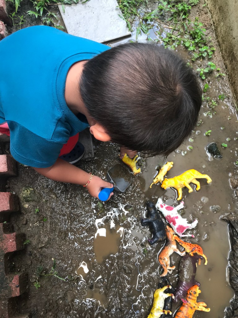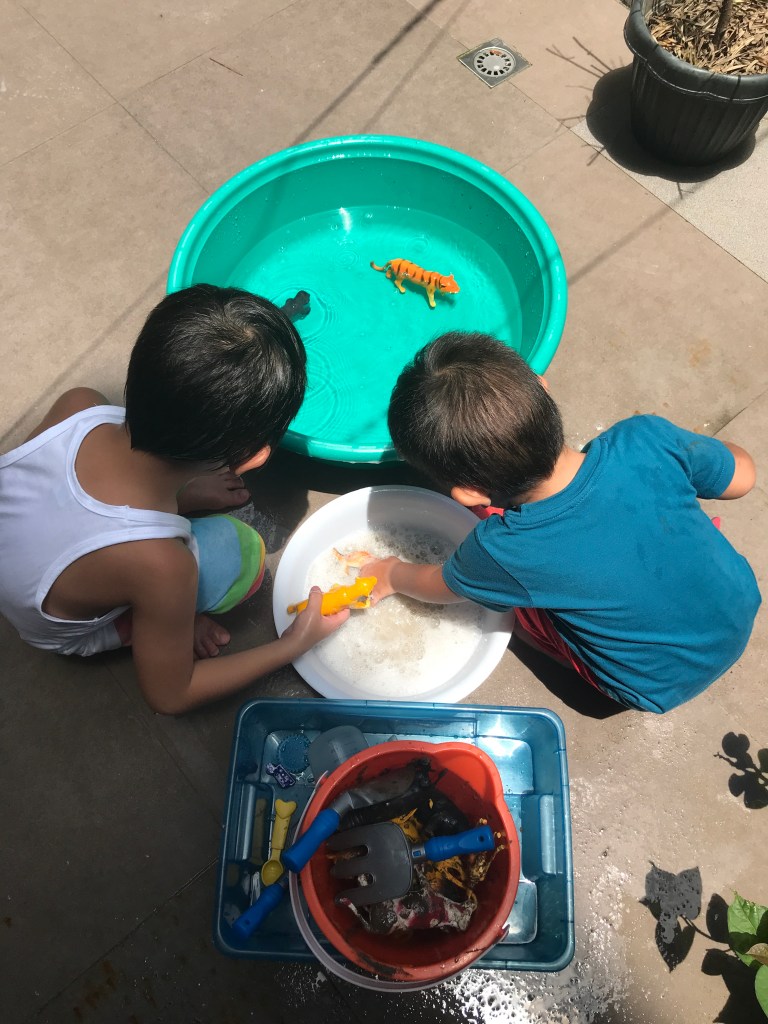 When the boys got tired of playing. It was time to round up all the animals for their bath. The boys used the digging tools to get the animals out of the mud. They called it their “bad animal rescue” 😂 Bad because they got so dirty.