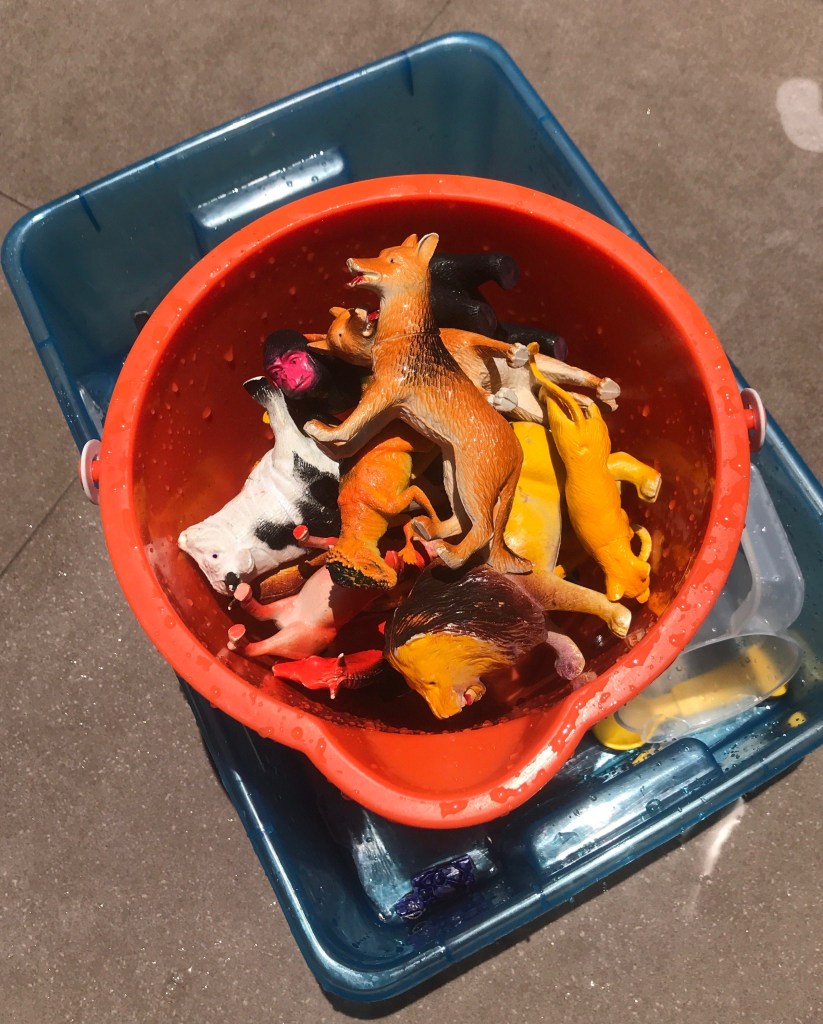 Set up an assembly line for the kids to wash the animals then drop them into the clean water.
