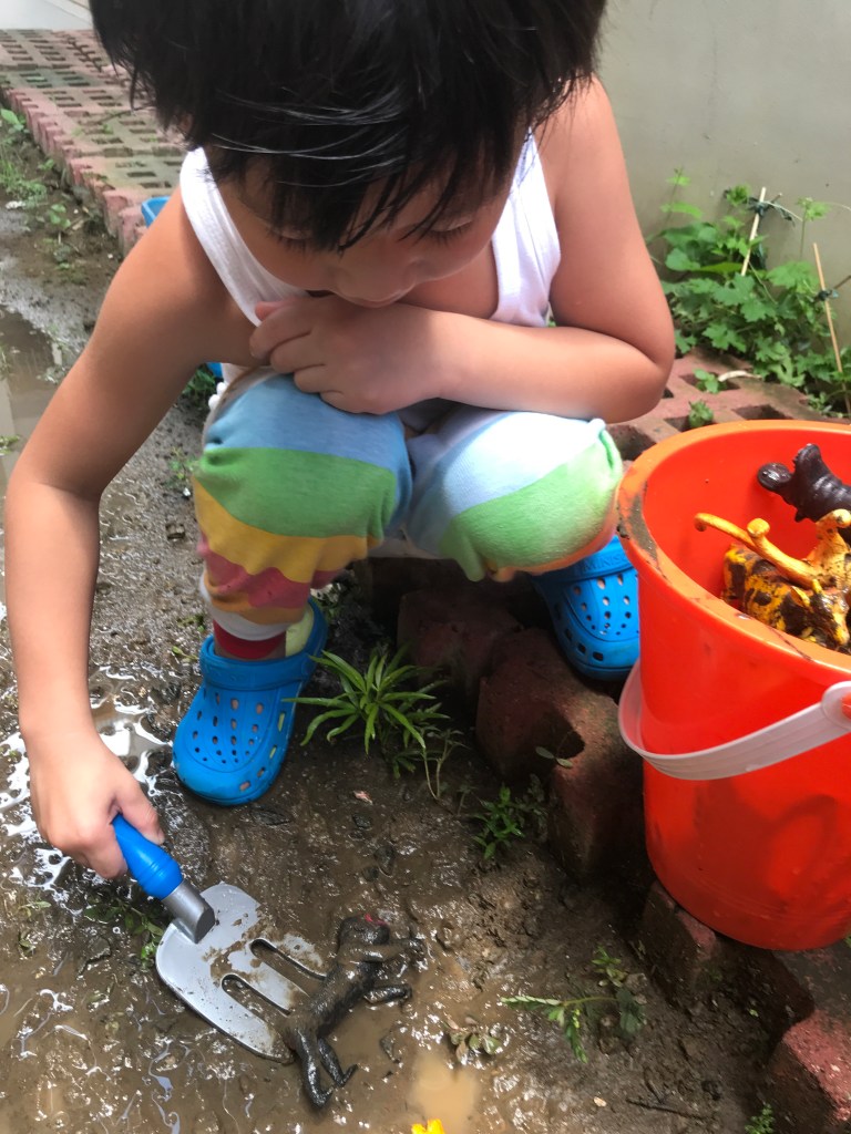 The boys spent a lot of time on this. Burying the animals and scooping mud on top of them. Muddy, messy, fun!