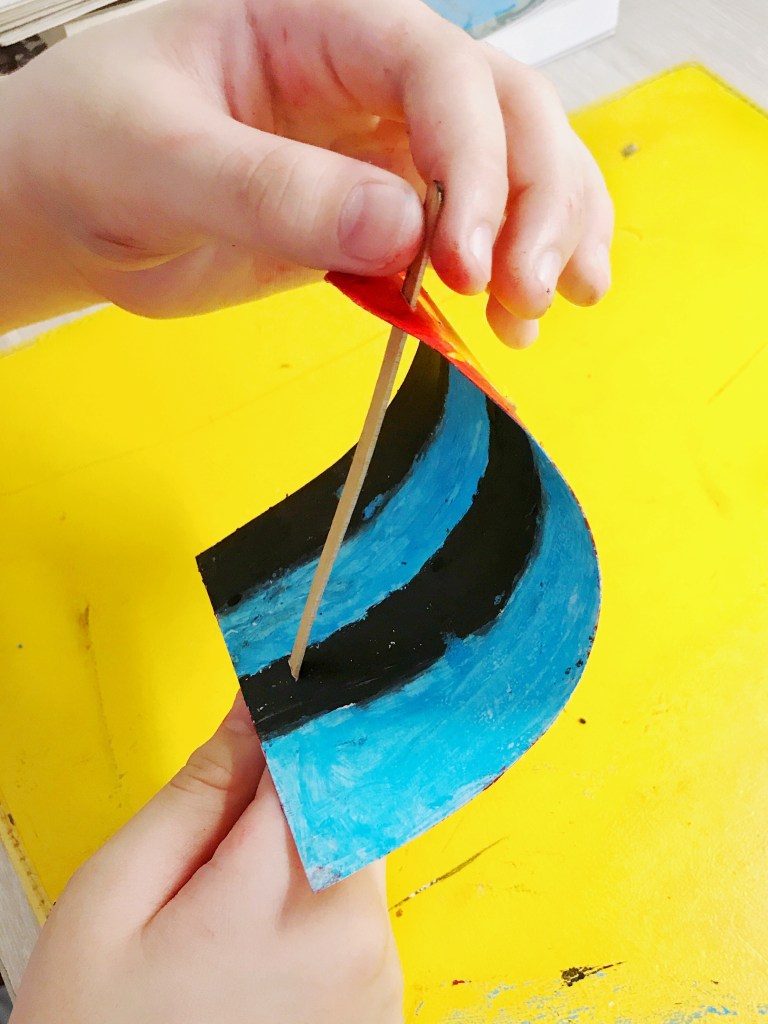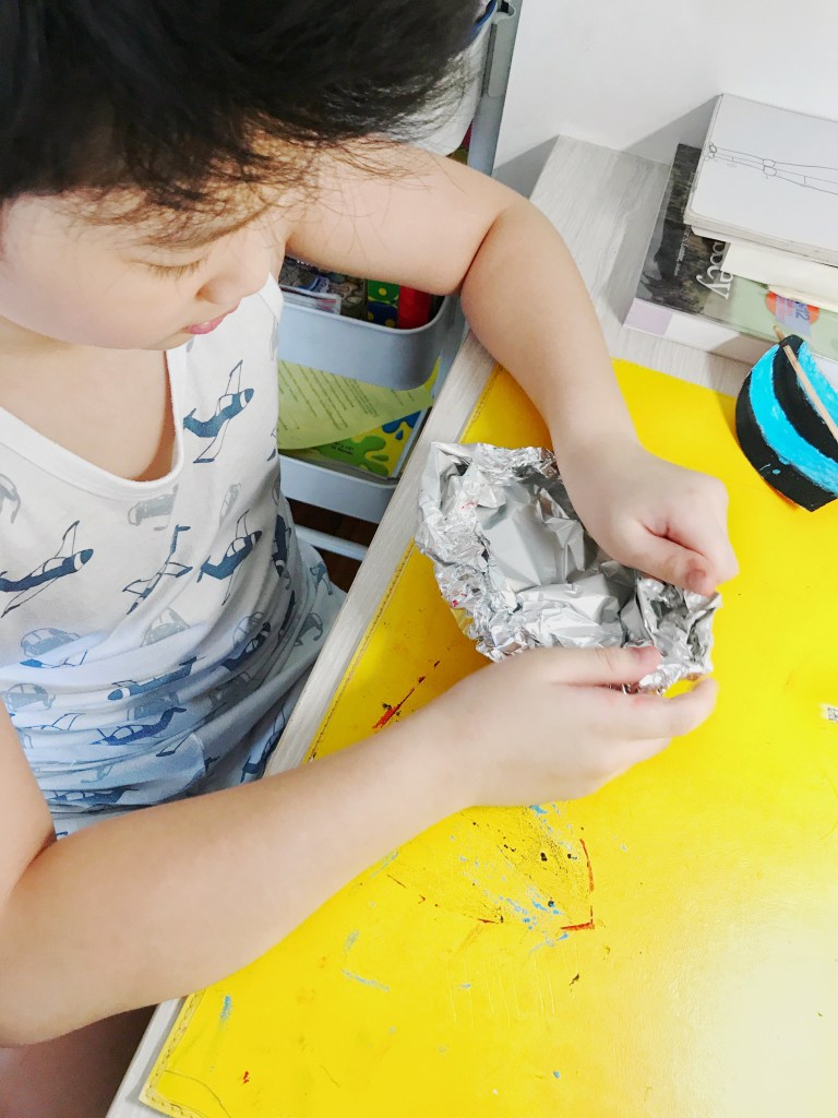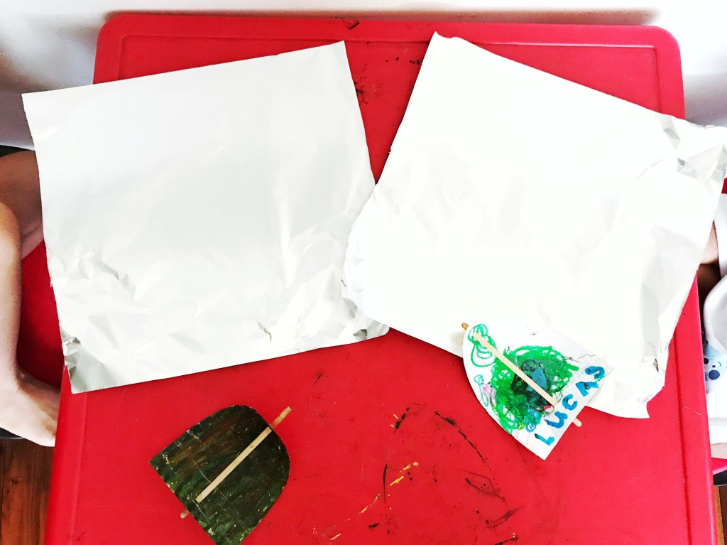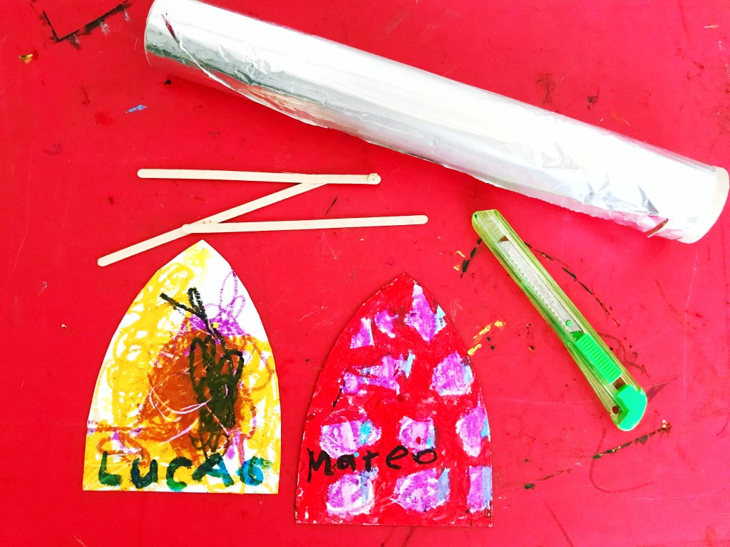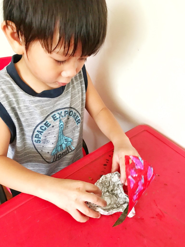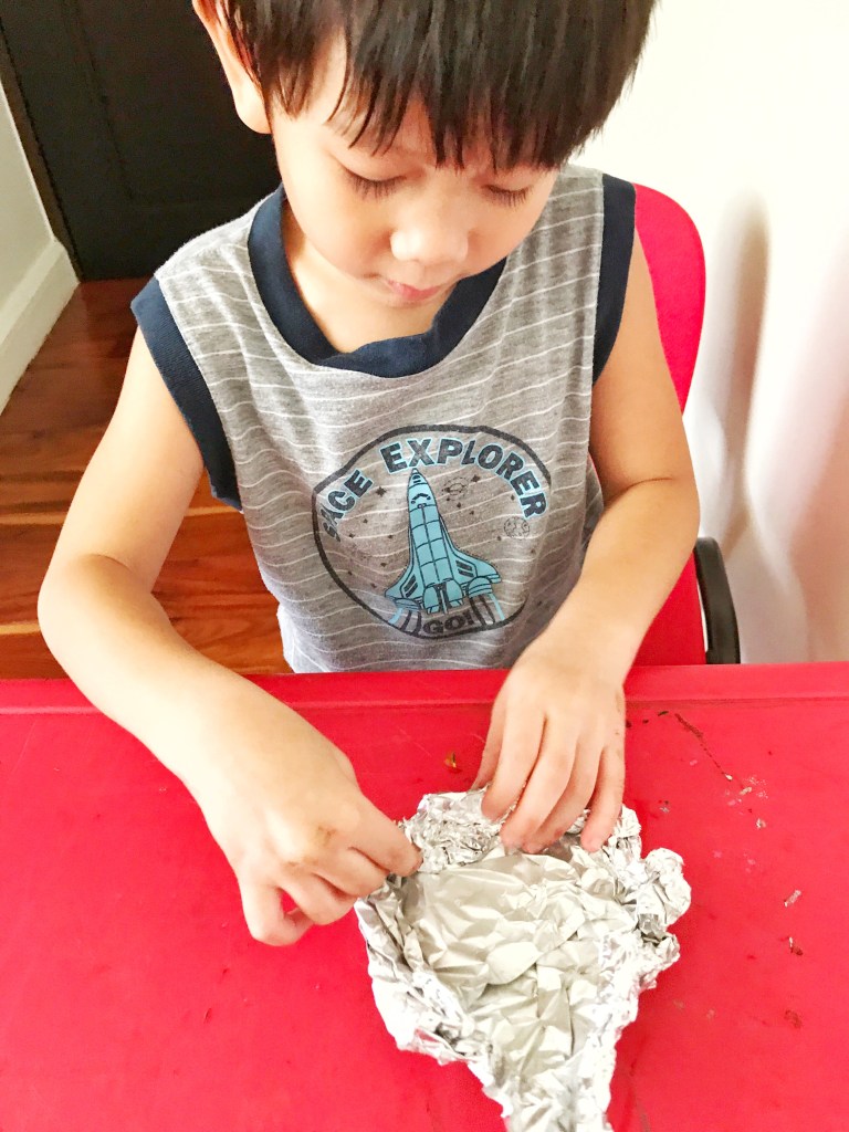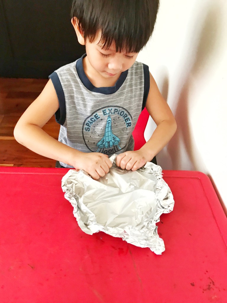 7. Make the boat using aluminum foil. Bunch it up, crumple it, let the kids design their own boat shape and attach the sail to it. The boys just bunched up some foil around the stick to keep it upright.