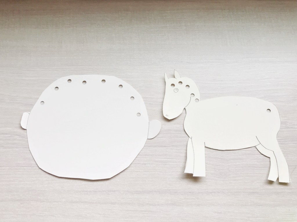 4. Tie the yarn to make hair/mane/ tail. Fold the yarn in half and thread it through the hole. The folded side should go in first. Make a hole in the middle of the folded yarn. Like this: