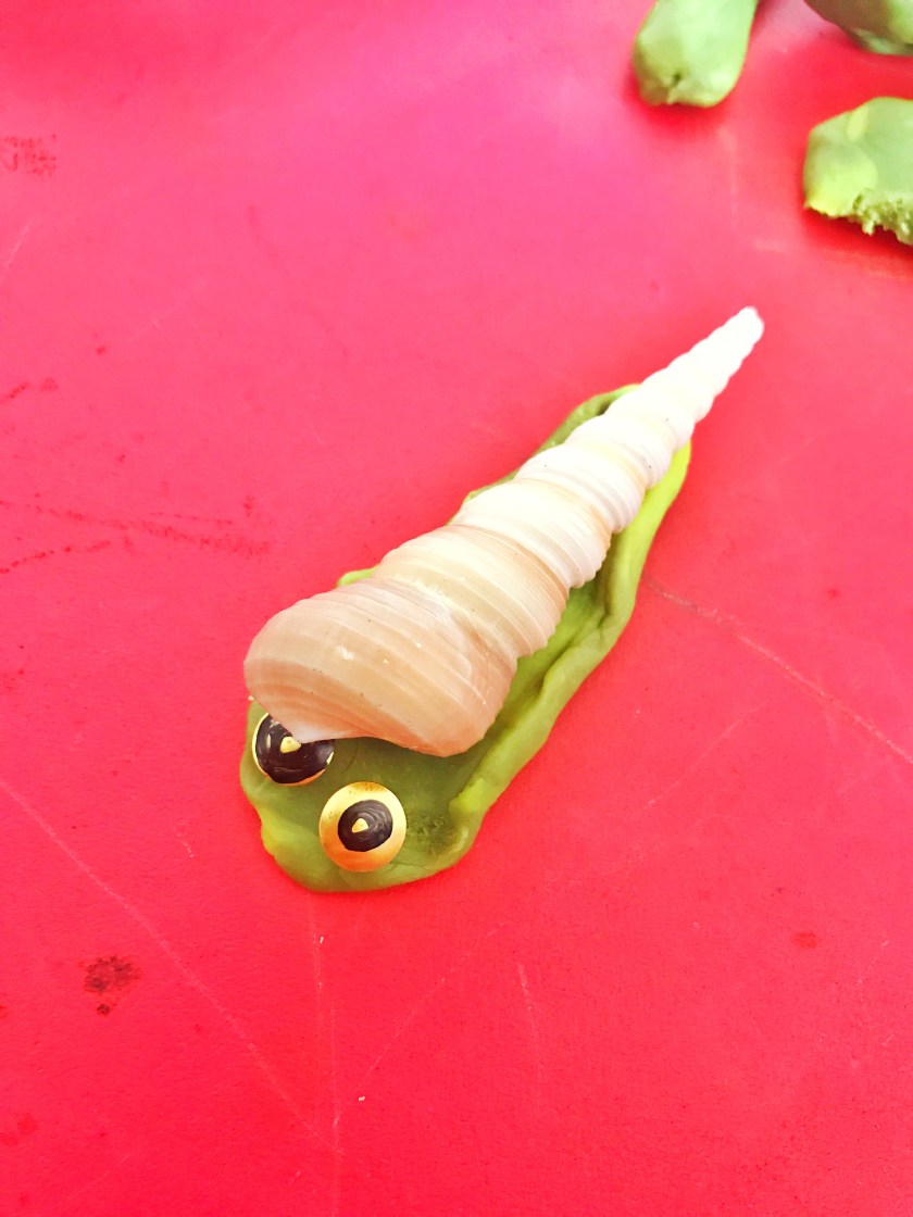 Shape the PlayDoh to make the muscular foot or body of the snail. Put the shell on top and add the eyes.