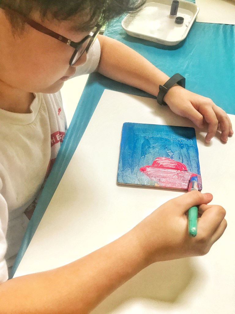 2. Use the paintbrushes to put paint on the back side of the wooden squares. Caleb painted half the square in different colors. While Luc and Teo opted for single colored squares. Any design is fine as long as you put the paint thickly.